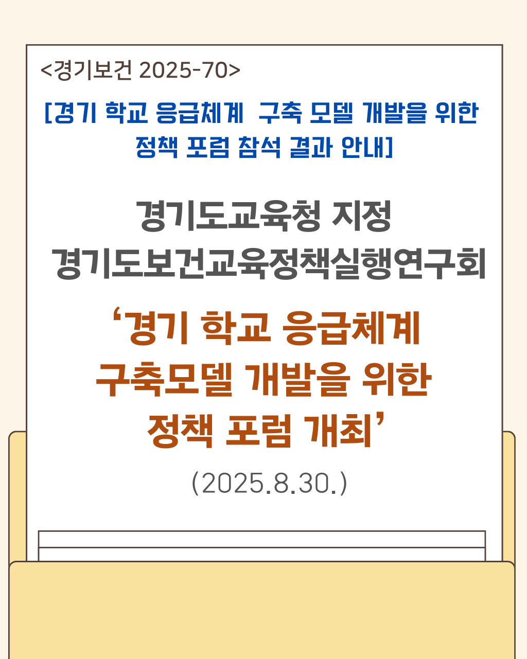 (관련기사)경기도보건교육정책실행연구회, ‘학교 응급체계 구축 모델 개발을 위한 정책포럼’ 성황( https://www.kyeonggi.com/a...