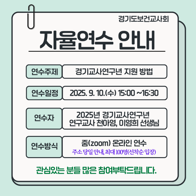 2025년 9월 10일, 경기도보건교사회에서는 경기교사연구년을 보내고 계시는 연구교사 천아영, 이영희선생님을 연수자로 모시고 <경기교사연구...